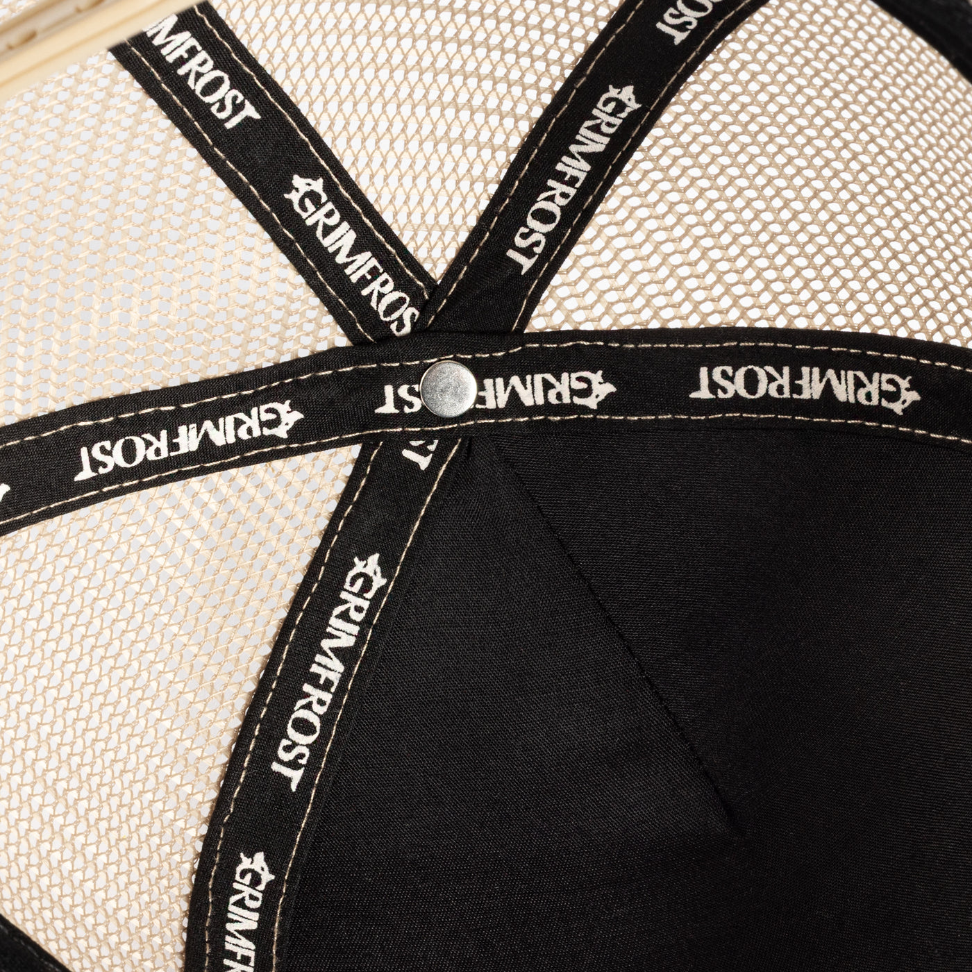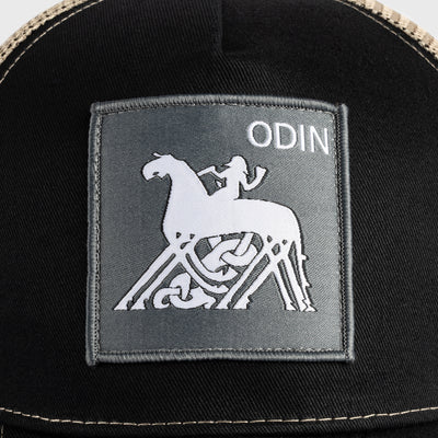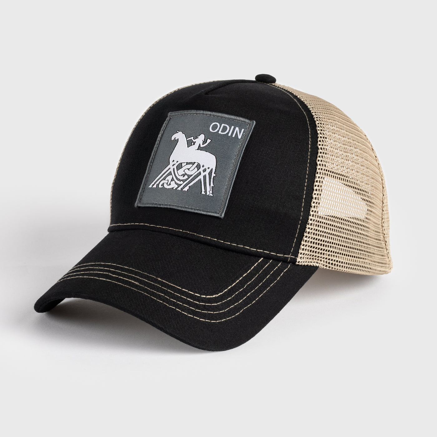 Top quality structured trucker cap with mesh panels. An image of Odin is added to the front. The inside is lined with tricot twill fabric for superior comfort and breathability.