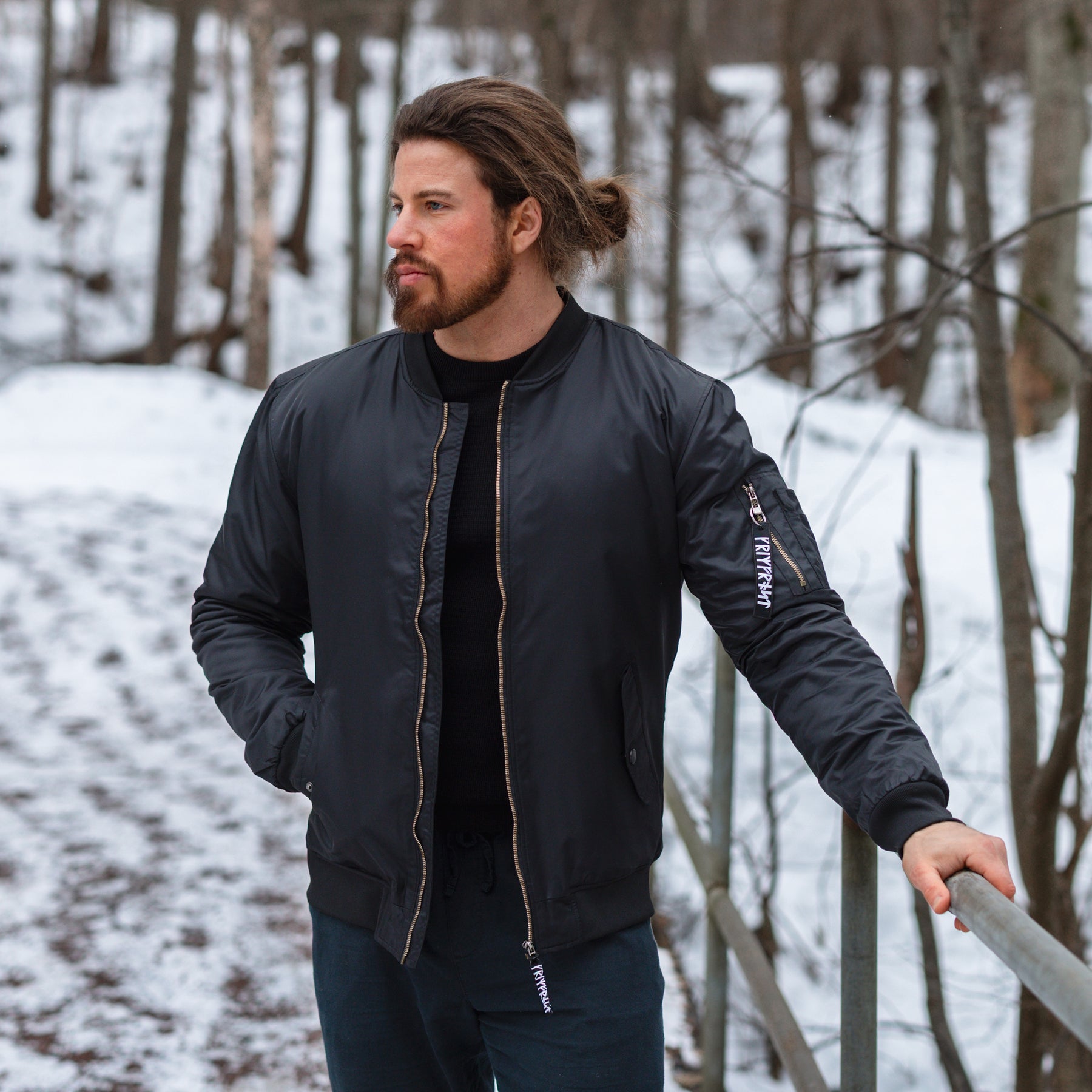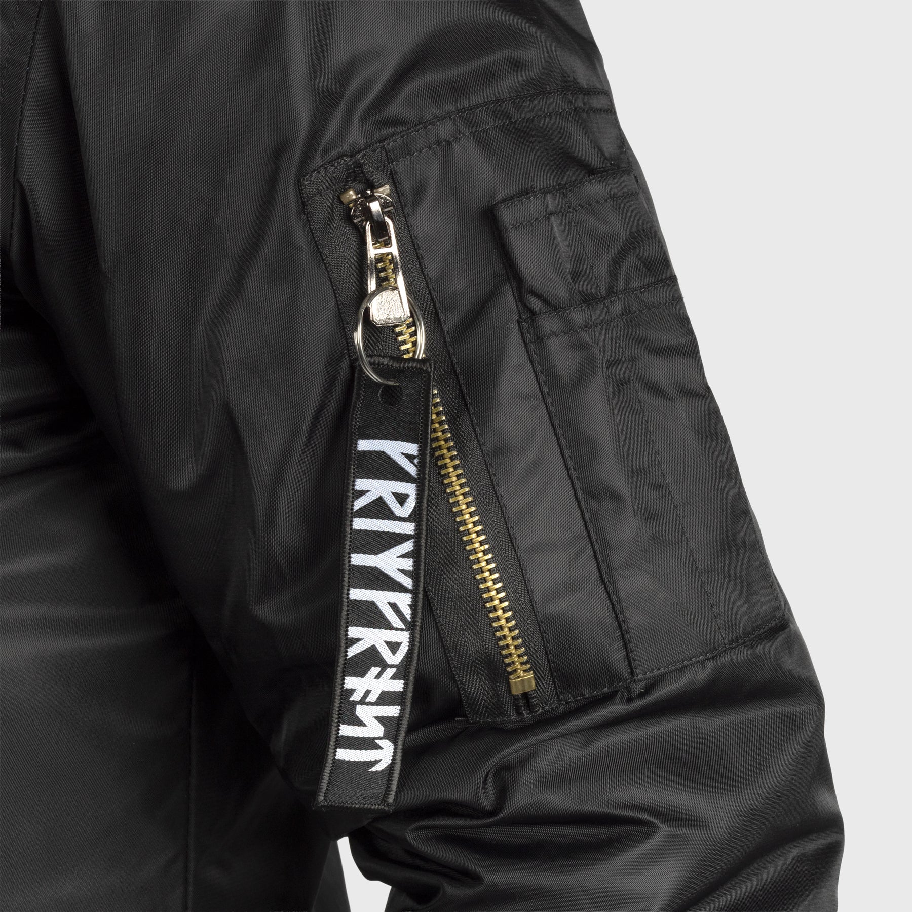 Classic bomber jacket crafted from 100% polyester for durable, all-weather performance. Its timeless silhouette combines urban style with practical functionality, ideal for everyday wear or layering in cooler conditions. Custom made for Grimfrost with runic tags and labels.
