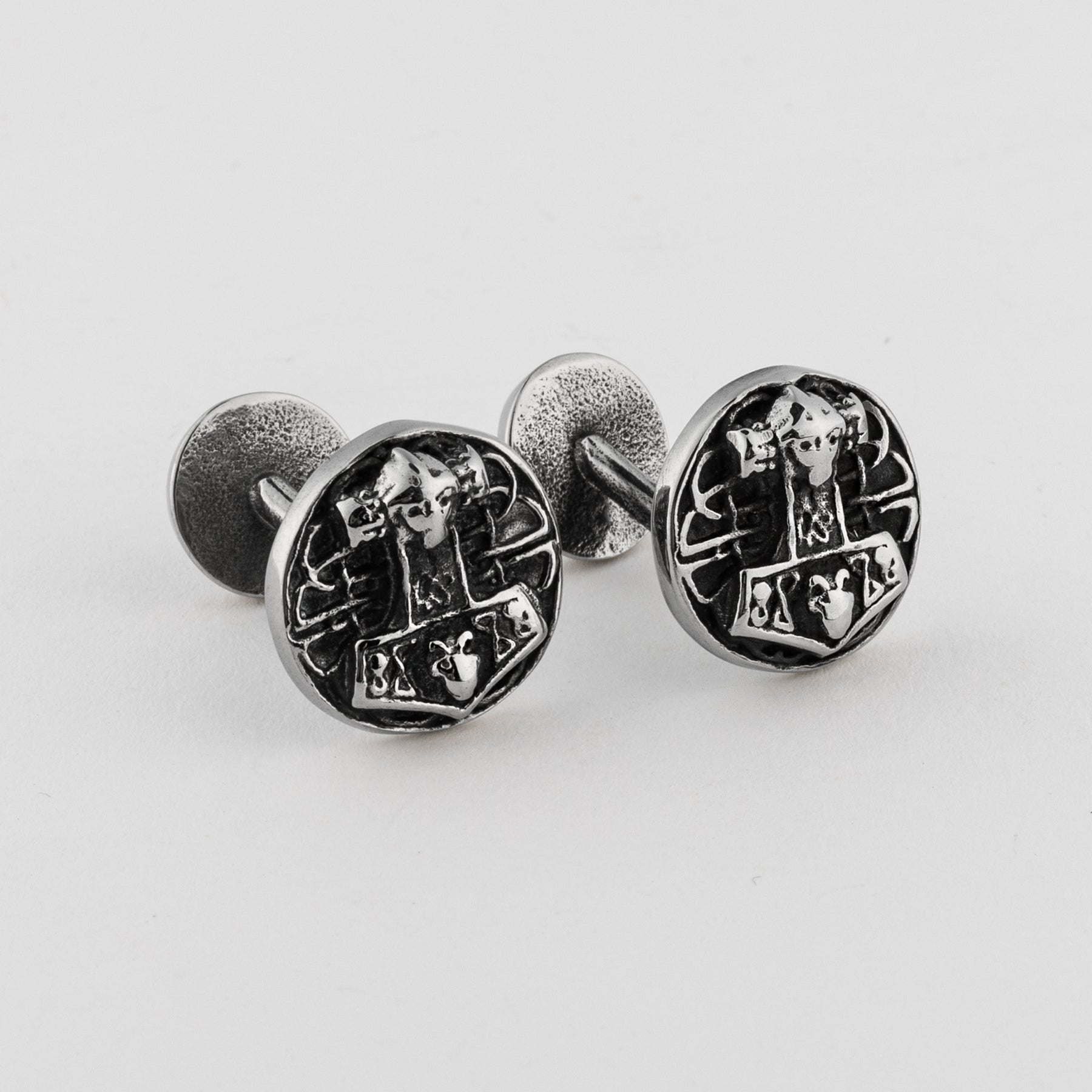Pair of cufflinks with a Mjolnir design. Combine them with the Mjolnir Disc Tie Bar.