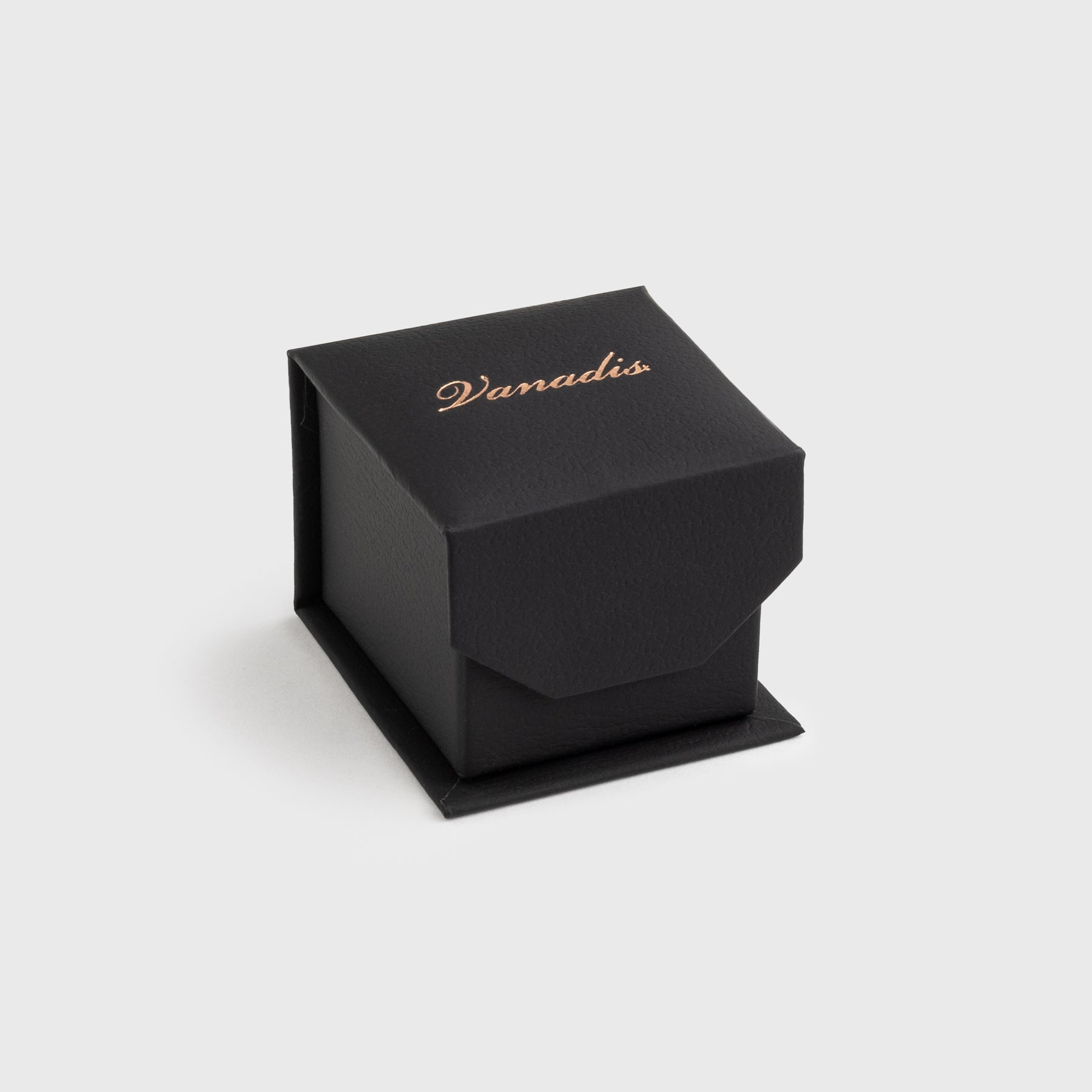 Die Schmuckschatulle ist mit einer mattschwarzen Außenseite aus Kunstleder gefertigt, die ihr ein raffiniertes und elegantes Aussehen verleiht. Es verfügt über einen diskreten Magnetverschluss, der den Deckel sicher an Ort und Stelle hält und gleichzeitig ein glattes Design beibehält. Der Innenraum ist mit weichem schwarzem Schaumstoff ausgekleidet, der Ihren Schmuck sowohl schützt als auch optisch aufwertet, sodass er sich ideal für alle Vanadis-Ringe oder kleineren Ohrringe eignet.