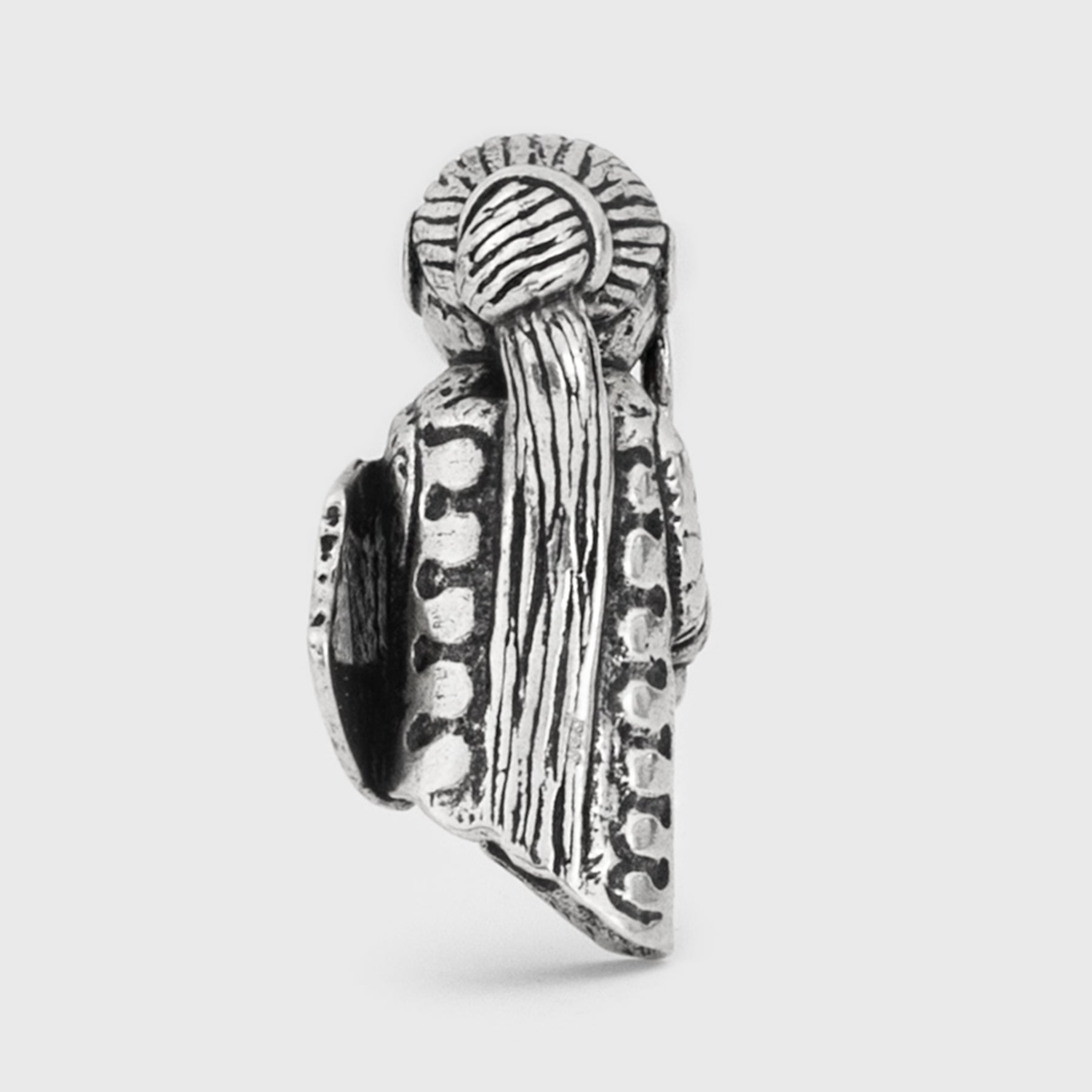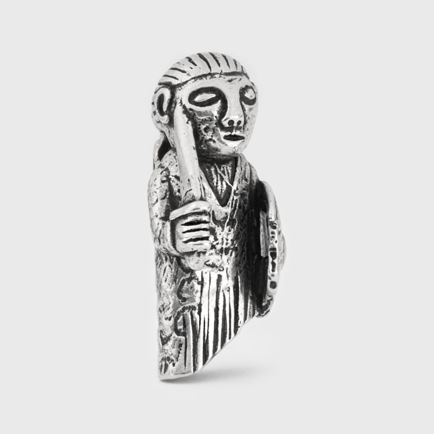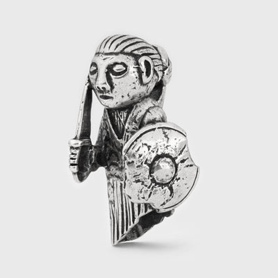Anhänger aus massivem Sterlingsilber, der vermutlich eine Walküre darstellt. Es ist eine Reproduktion des Originals aus der Wikingerzeit, das 2012 auf der dänischen Insel Fünen gefunden wurde. Der Original-Anhänger wird auf ca. 800 n. Chr. datiert und befindet sich in der Nationalmuseum von Dänemark. Die Figur trägt ihr Haar zu einem geknoteten Pferdeschwanz und hat ein langes Gewand, wie man es von vielen anderen weiblichen Darstellungen in der Wikingerkunst kennt. In der rechten Hand trägt sie ein aufrechtes Schwert, in der linken einen Schild.