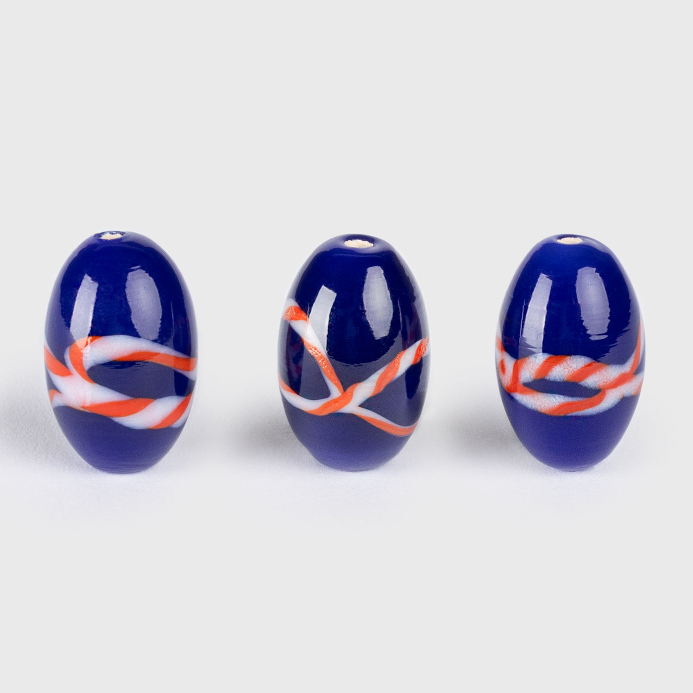 Drei Wikinger-Glasperlen. Sie wurden traditionell durch Aufwickeln von Schichten aus geschmolzenem Glas auf einen Metallstab hergestellt. Glasperlen wurden sowohl von Männern als auch von Frauen häufig für Halsketten verwendet. Frauen trugen sie auch zwischen Schalenfibeln hängend.
