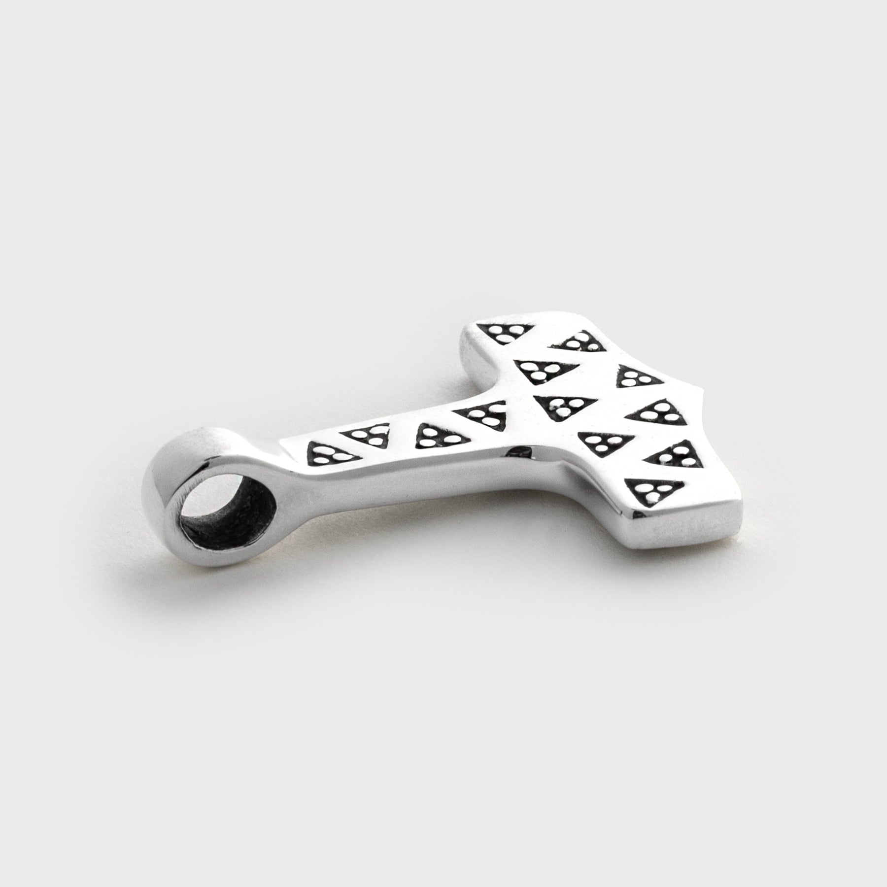 A reproduction of the Thor’s Hammer found in 1828 in the Moheda parish, in Småland, Sweden. The hammer was part of a larger treasure that was placed in a clay urn and buried. The original find is today located at the Småland County Museum in Växjö, Sweden. The original hammer was found with a ring. Stamping triangles was a common way of decorating jewelry during the Viking Age.