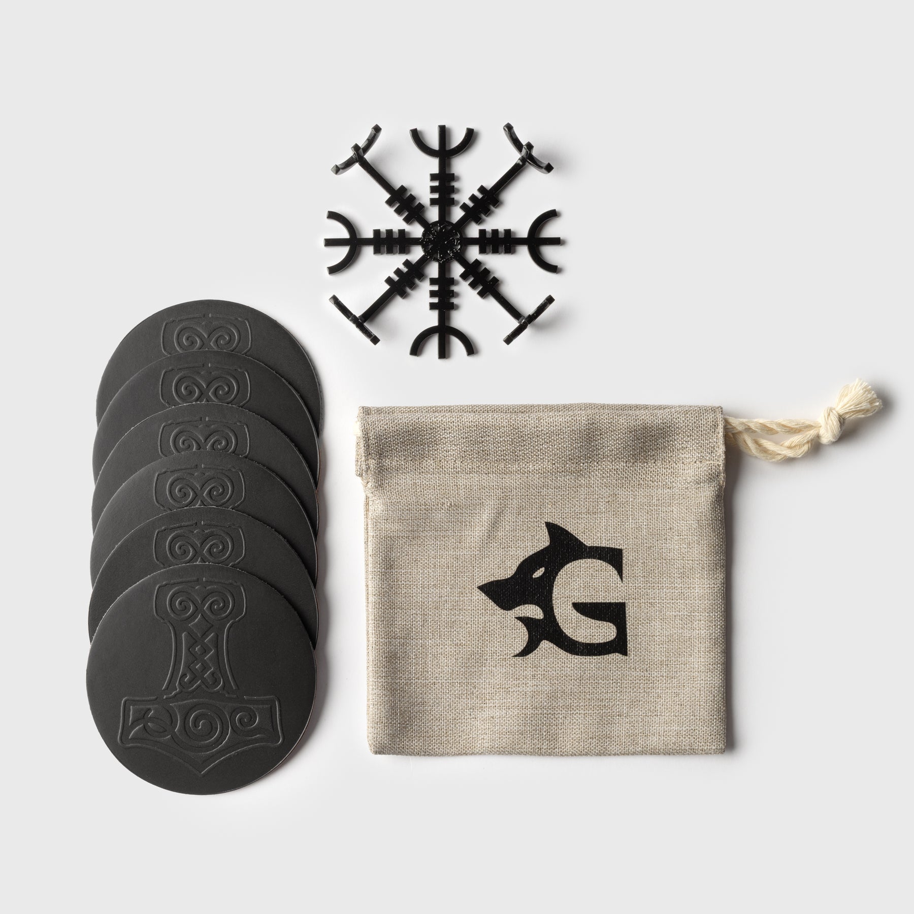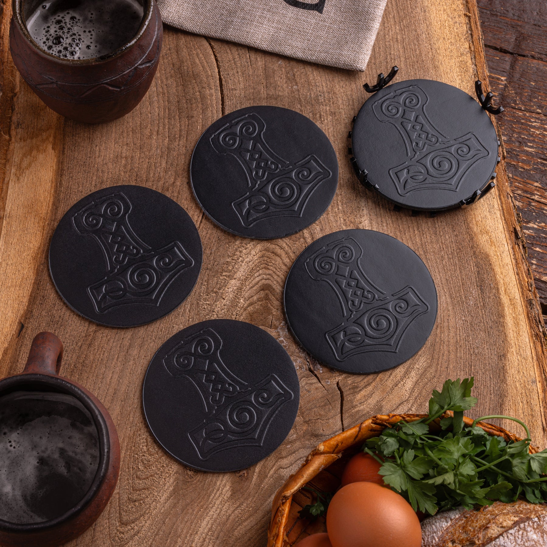 Practical and stylish coasters made of durable, high-quality leather. They come with an iconic Mjolnir design and a forged holder in the shape of the Aegishjalmur symbol.