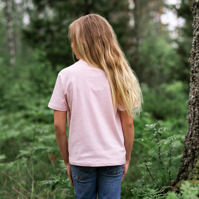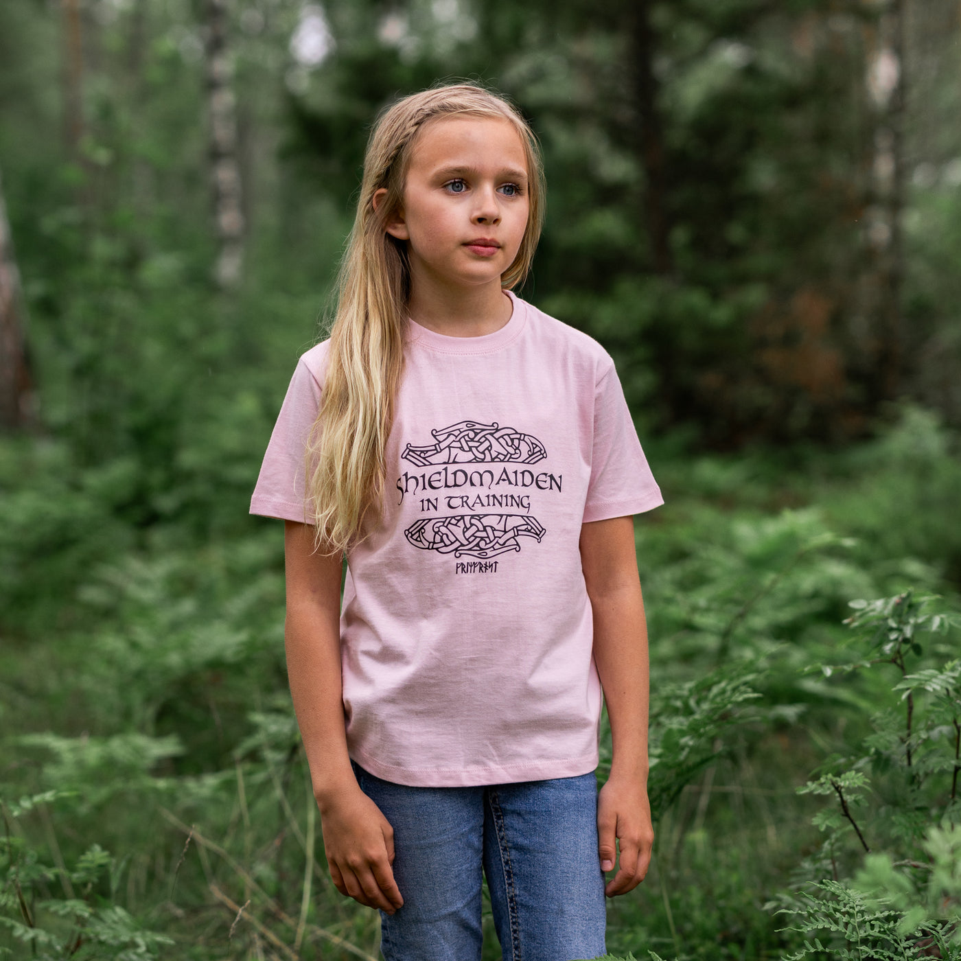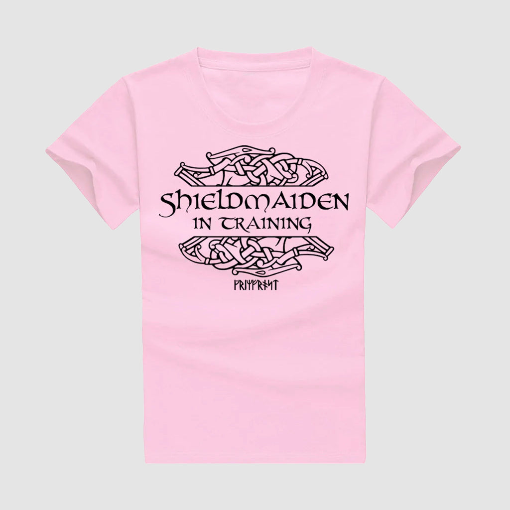 Top-quality kids t-shirt handprinted in Sweden with a front print: "Shieldmaiden in Training". Production and copyrighted design by Grimfrost.
