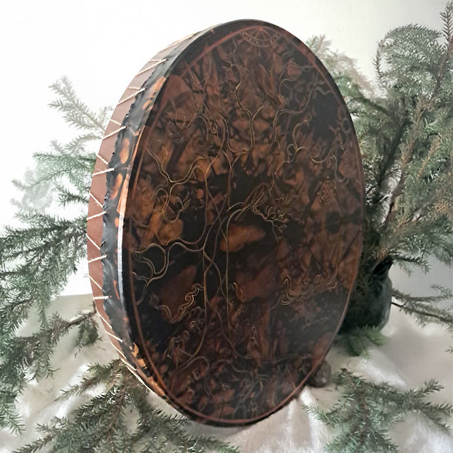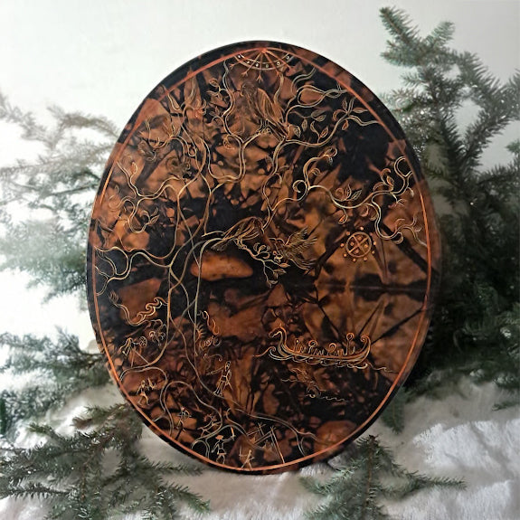 Yggdrasil, the World Tree, is beautifully painted by hand onto the drumskin. Yggdrasil is very important in the Viking Age worldview. The entire universe is built around it.