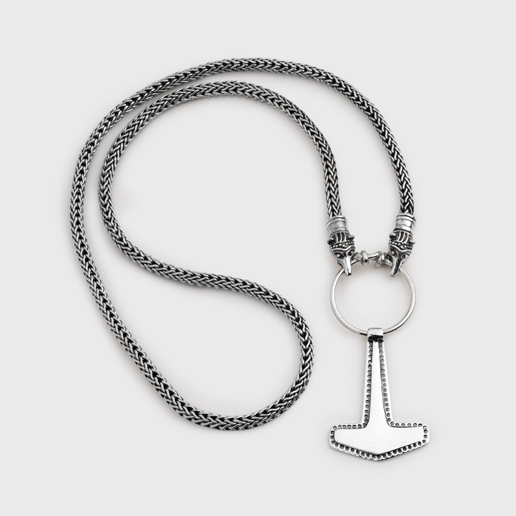The hammer is made in solid Sterling Silver. It is a based on the pendant found in the incredible trove of silver treasure discovered in 2018 on the Ruegen island in the Baltic Sea. The hammer was discovered among hundreds of silver coins, rings, pearls and bracelets. The original hammer's decor was applied a bit sloppily, which was hard and unnecessary to mimic. We decided to add straight lines of decoration with small holes instead of stamped dots.