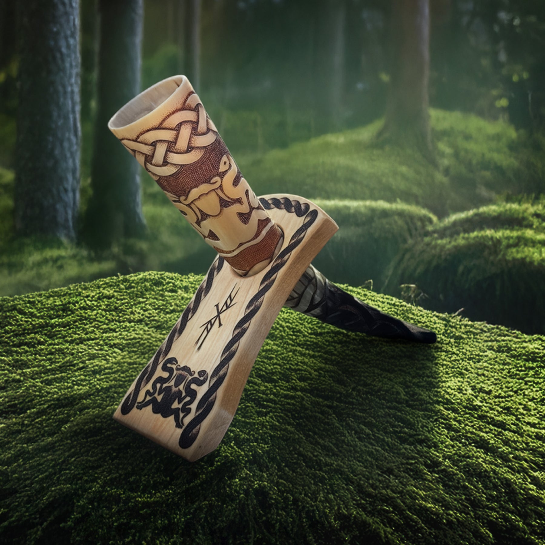 This 2 pint, very detailed horn has had a lot of work invested in it. It is inspired by the Picturestone in Gotland, Sweden, that has the original design. The artist's interpretation differs slightly from the most common one. He sees her as the "first witch", hence the runic writing "wurmawikko-hagatusi" in the Elder Futhark. The knotwork design matches the 600s and the style of the Picture Stone. The animals in the triangular triskele have been changed to a wolf, raven and snake, which fits better with the artists interpretation of the motif.