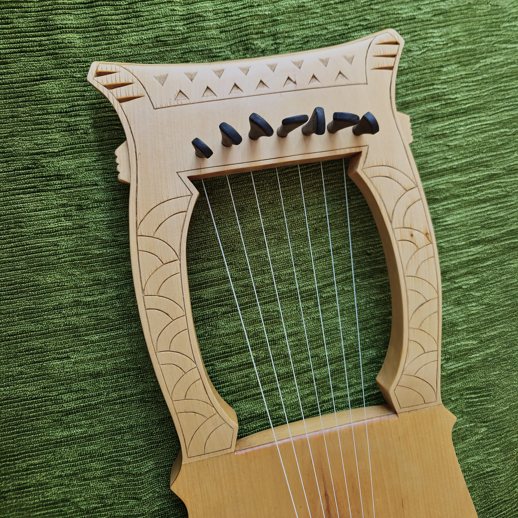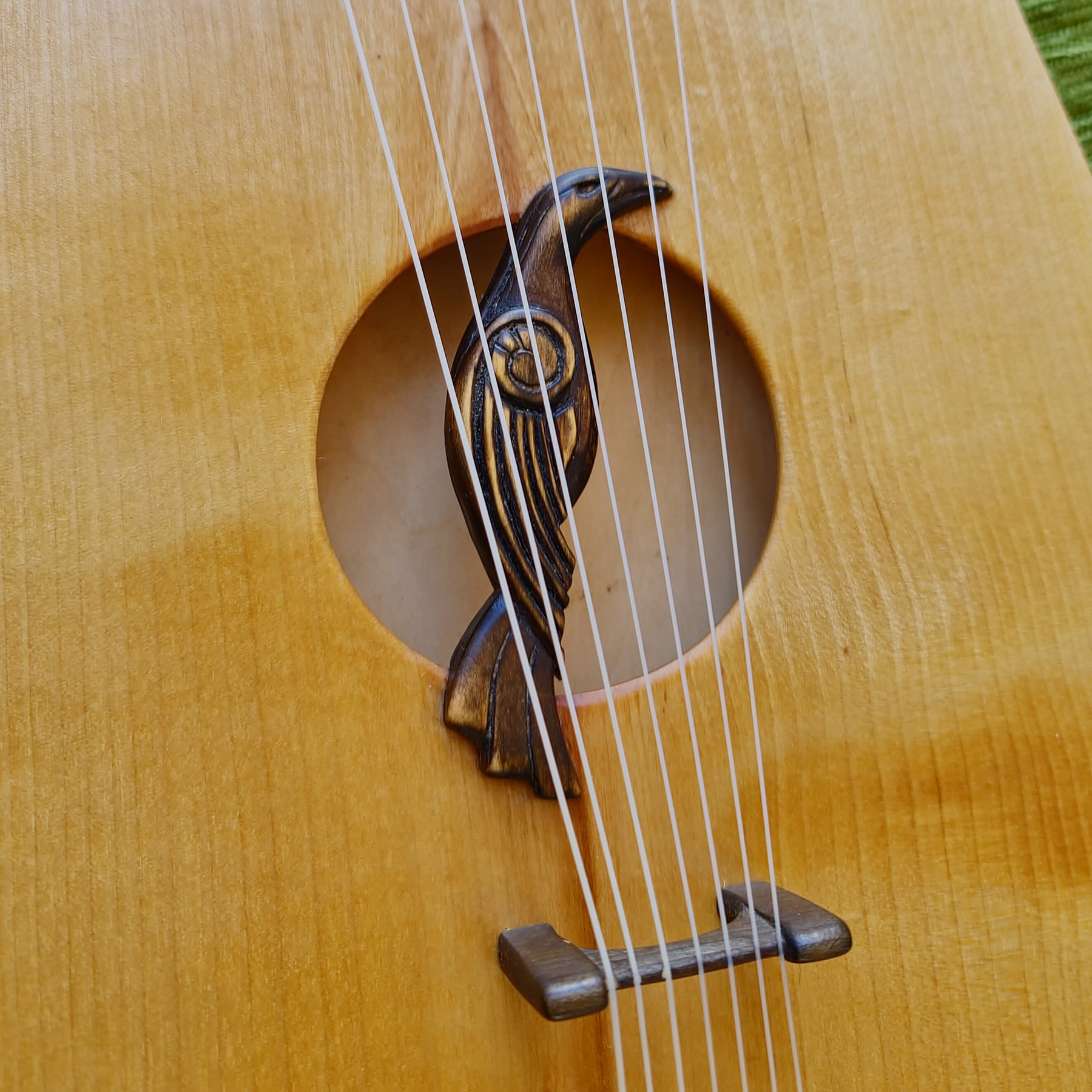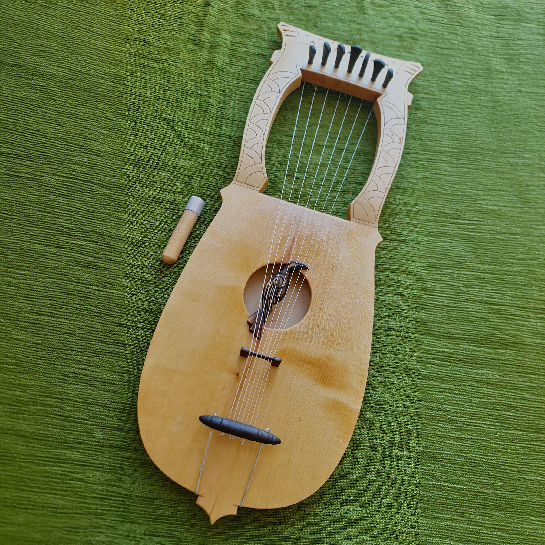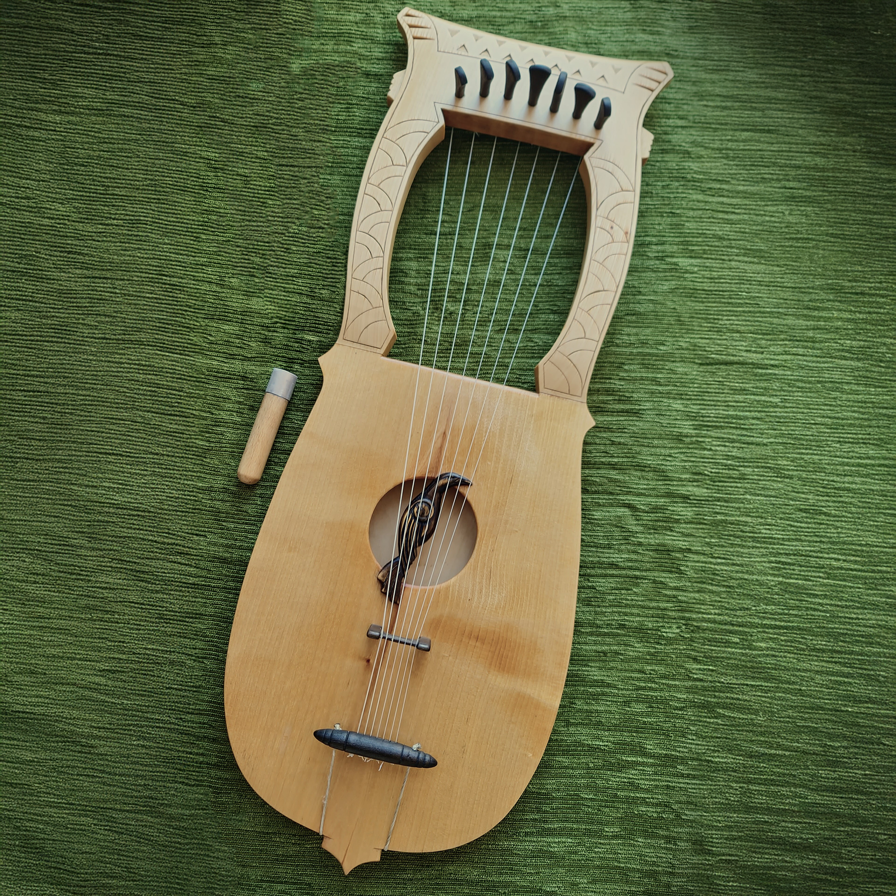 A meticulously crafted replica of a 16th-century Kravik lyre made out of linden wood, tuned to A–C–D–E–F–G–A. The instrument is finished with a hand-applied shellac polish, giving it a warm, natural sheen. It features a distinctive raven motif carved in a Nordic-style sound window, symbolizing wisdom and mystery. All components have been carefully ebonized, enhancing the contrast and lending the lyre an elegant, timeless character that reflects the spirit of early Scandinavian craftsmanship.