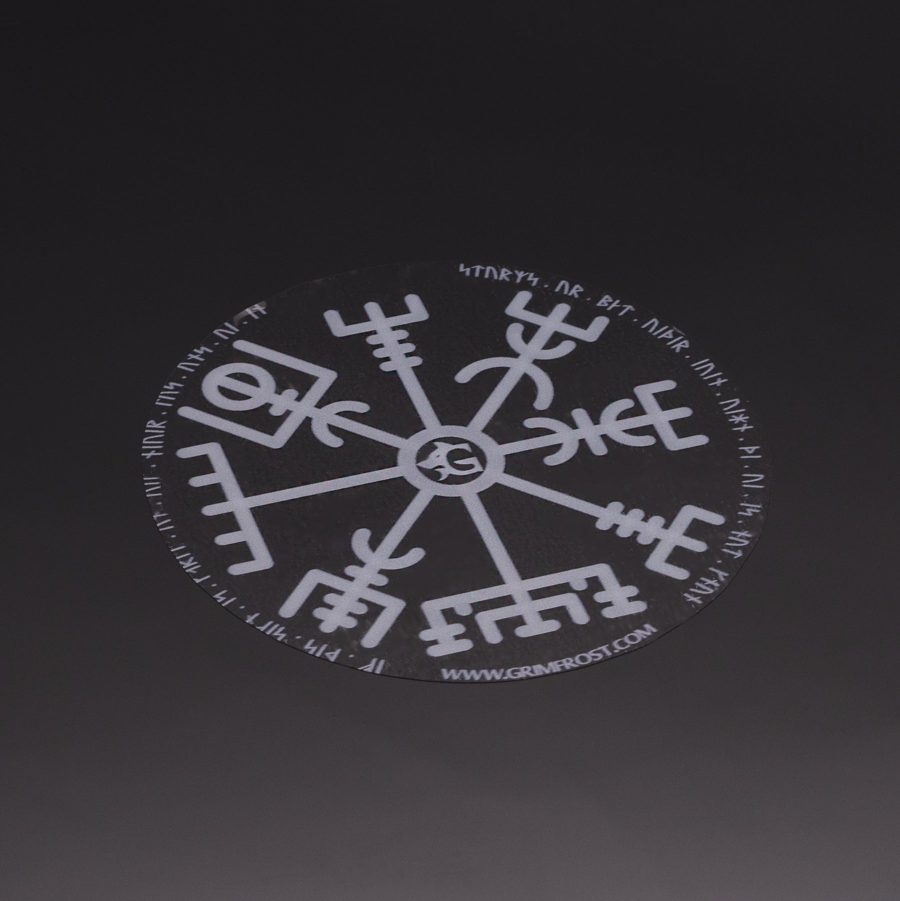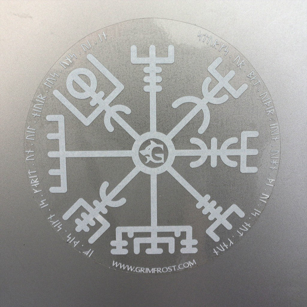 A round, transparent sticker with the Vegvisir symbol. The Vegvísir is an Icelandic magical symbol of navigation, also known as the "Runic Compass". The Old Norse word translates to 'guidepost' or 'direction sign'. An old manuscript declares that "if this sign is carried, one will never lose one's way in storms or bad weather, even when the way is not known". That phrase is also written on the sticker with the runes surrounding the symbol.