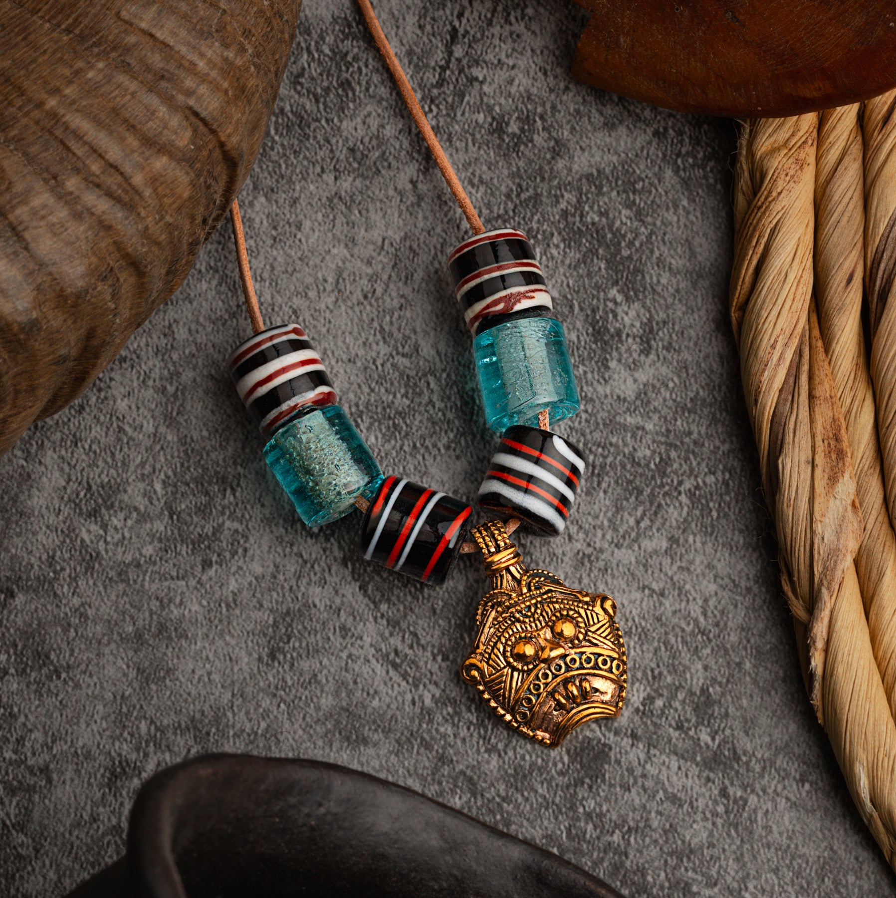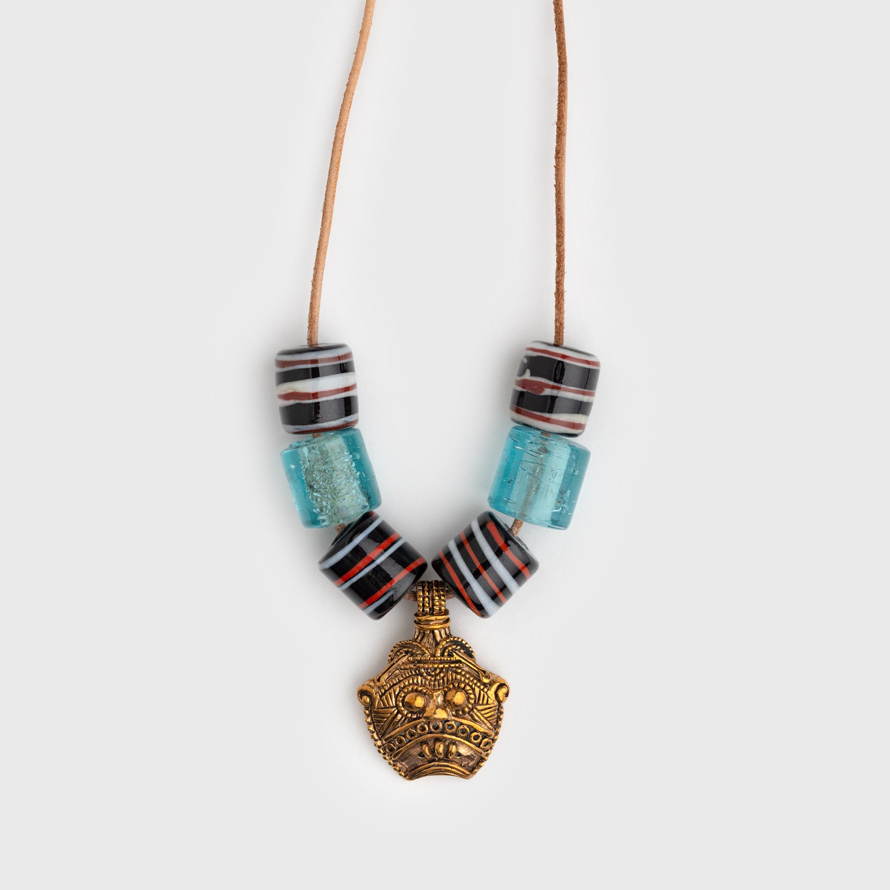 Reproduction of the extraordinary Loki amulet find made in 2015 in Vejen, Denmark as a ready to wear necklace with Viking glass beads. It is believed to depict Loki with his mouth sewn shut as in described in Norse mythology. The original find is today located at the Danish National Museum. The amulet is handmade in solid bronze.