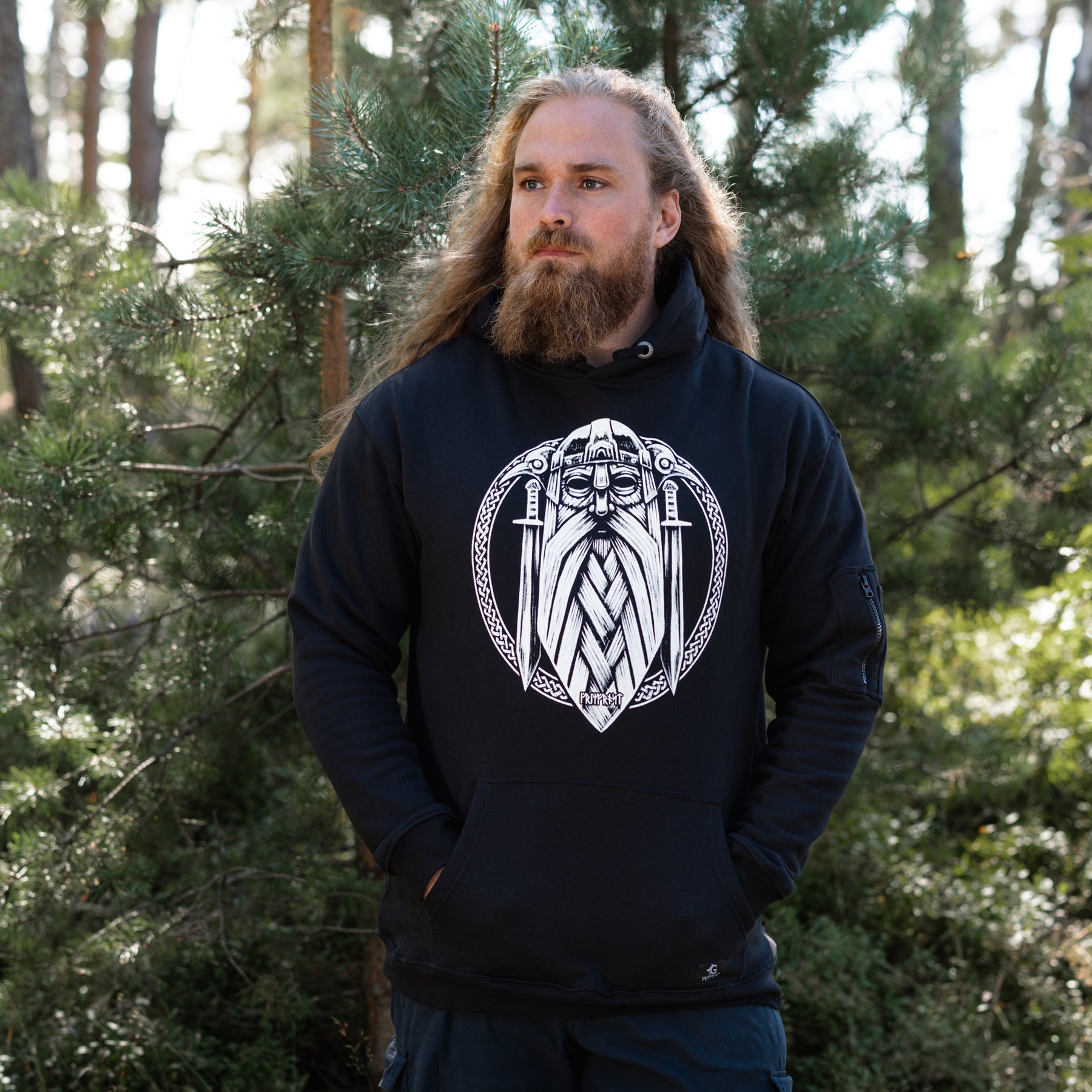 Meet your new favorite hoodie. This premium pullover hoodie is custom-made for Grimfrost in soft, luxurious organic cotton. Even the dyeing and printing processes are fully organic, which is good for both You and Mother Earth. The hoodie comes with a zipped utility pocket on the left arm and spacious kangaroo pouch pockets. To top things off, we have given the drawstring eyelets a Younger Futhark runic circle.