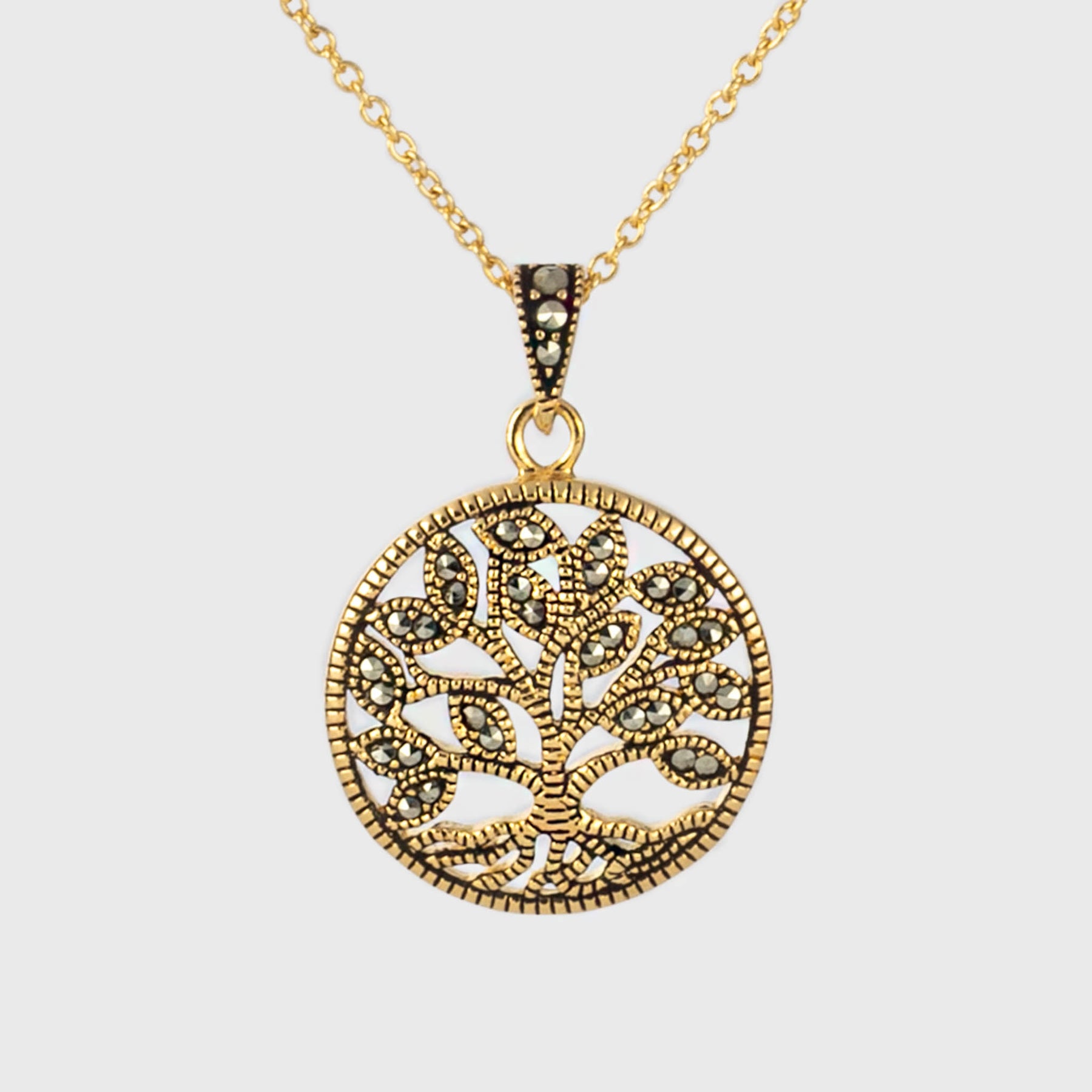 A beautiful pendant inspired by Yggdrasil, the world tree in Norse mythology. Expertly handmade of solid sterling silver 925 with an 18 carat gold plating and marcasite stones, this pendant is guaranteed to please.