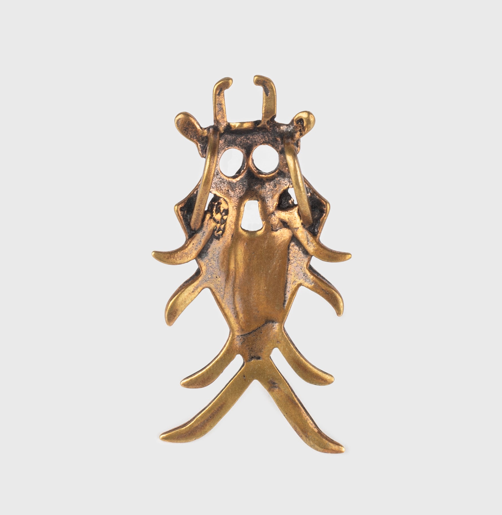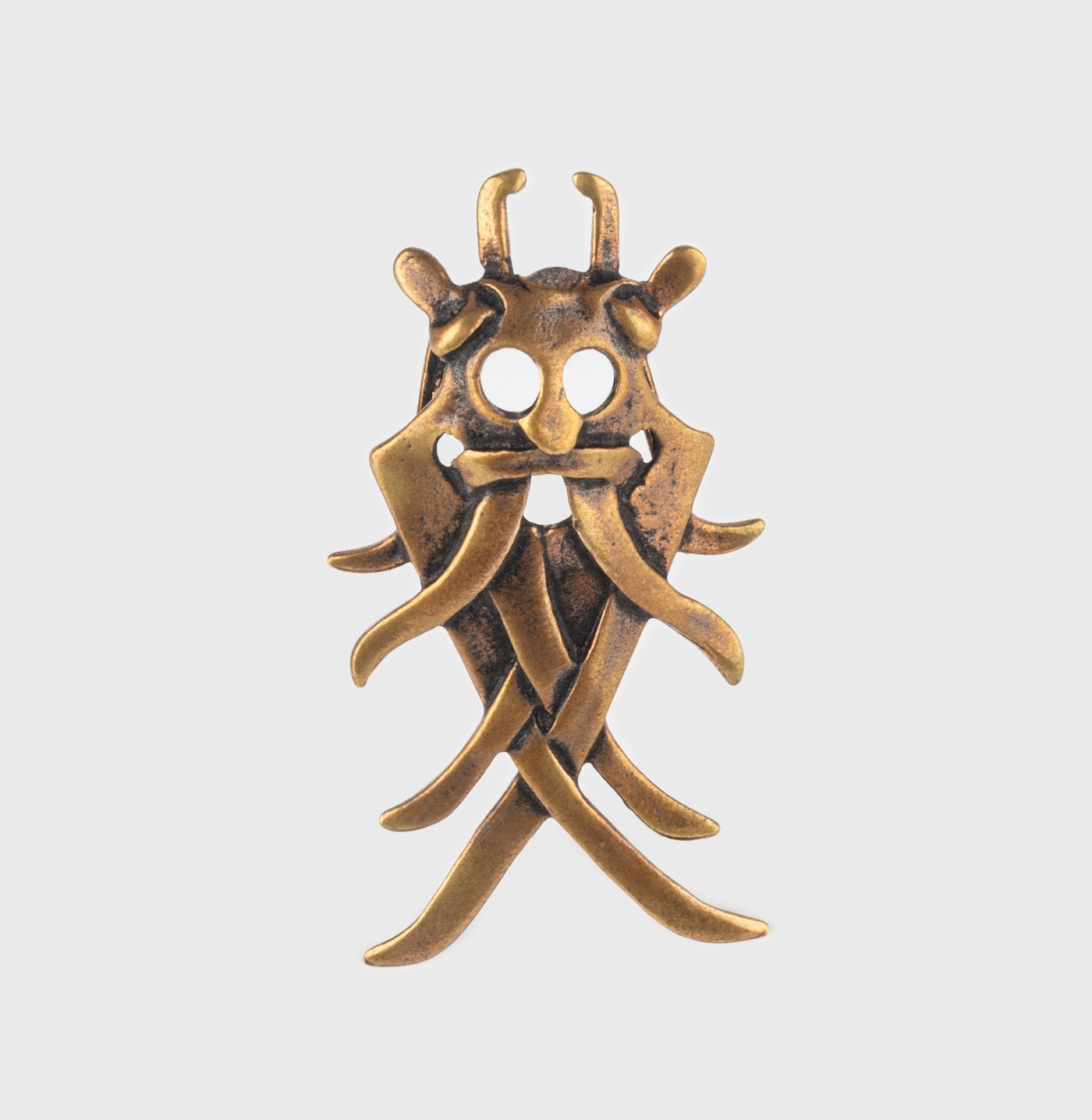 Handmade pendant depicting the facial mask found on a Viking Age runestone that was discovered in Aarhus, Denmark. Masks were a common motif believed to protect against evil. The inscription on the runestone memorializes a man who died in a battle. Translated to English, it reads: "Gunnulfr and Auðgautr and Áslakr and Hrólfr raised this stone in memory of Fúl, their partner, who died when kings fought."