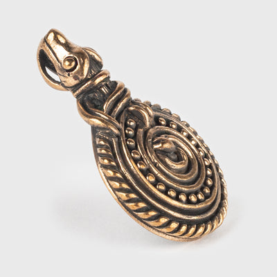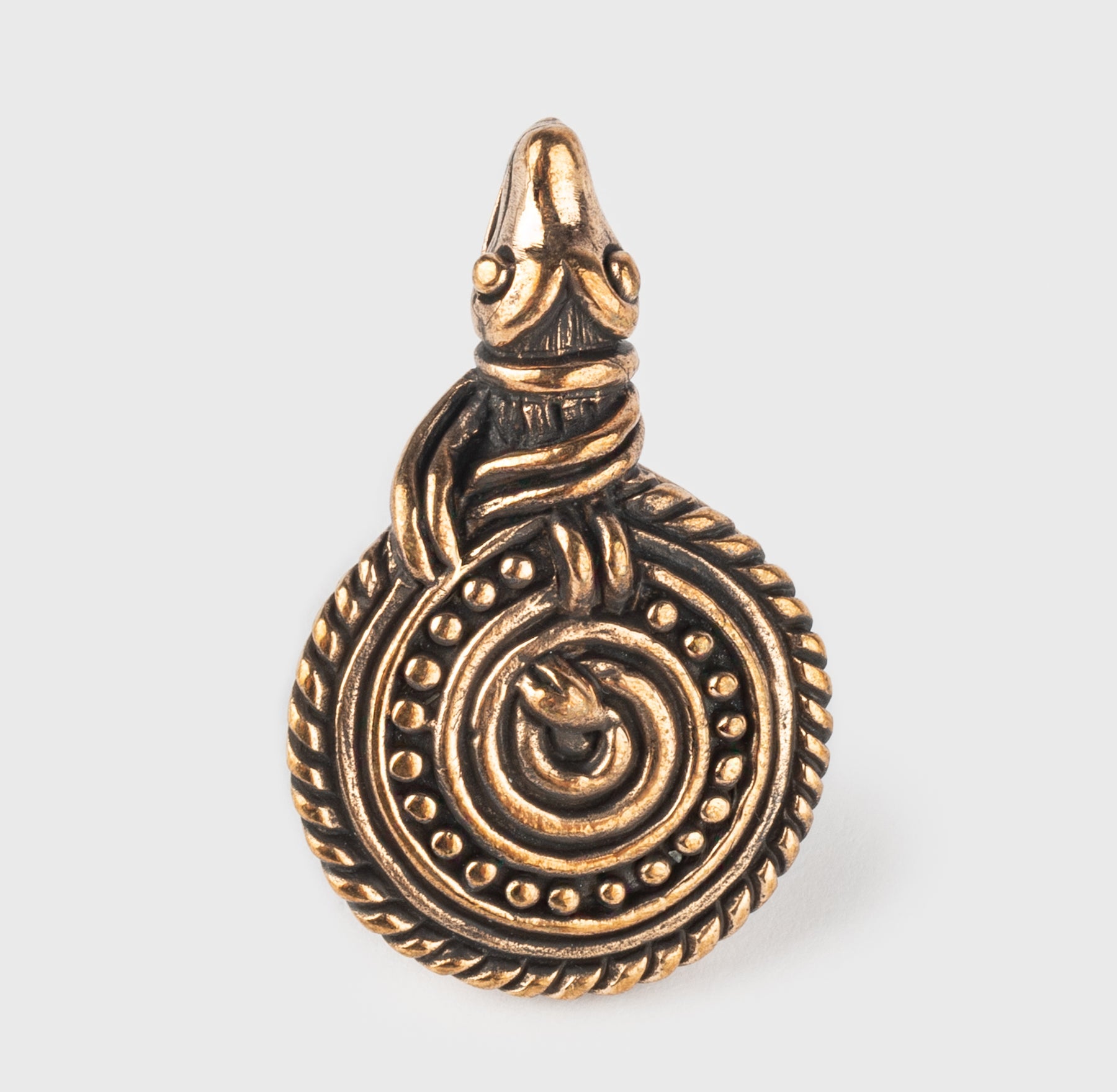 Bronze reproduction of a pendant found in the remarkable Viking Age treasure in Eketorp, Sweden. It depicts a coiled snake, which fits well with Níðhöggr in Norse mythology.