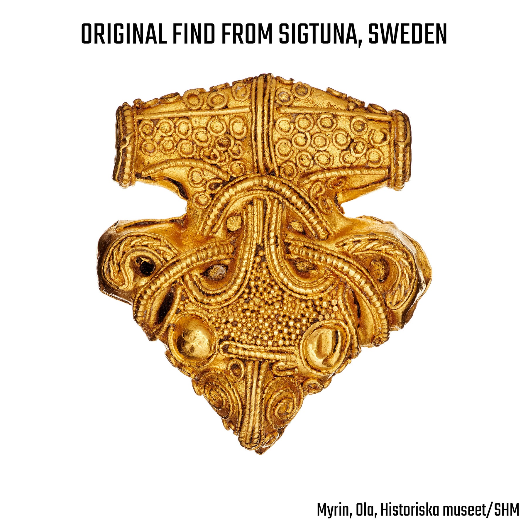 A faithful and carefully handmade replica of the Thor’s hammer found in Sigtuna, Sweden. The hammer has a stylized raven head’s shape and is covered with filigree and granulation.