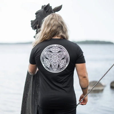 The designs are all based on finds dating to the Viking Age. The back and the chest motifs are based on the Vårby brooch found here in Sweden.