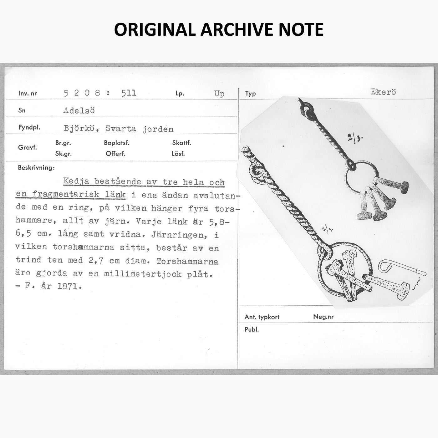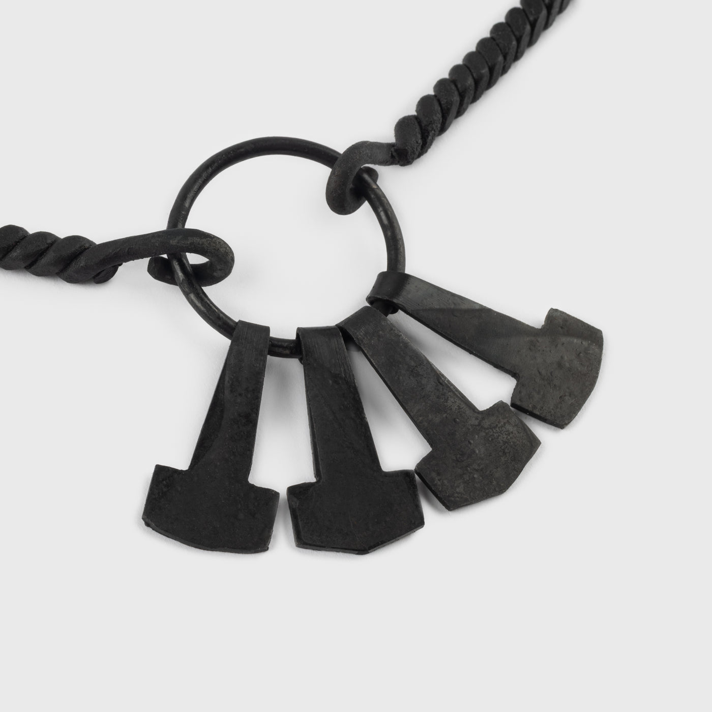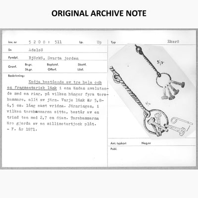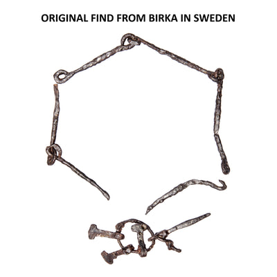 Meticulously crafted reproduction of the forged iron chain and amulet ring with 4 Thor's Hammers that was found in Birka, Sweden. The ring can be opened in case you'd like to replace the pendants.