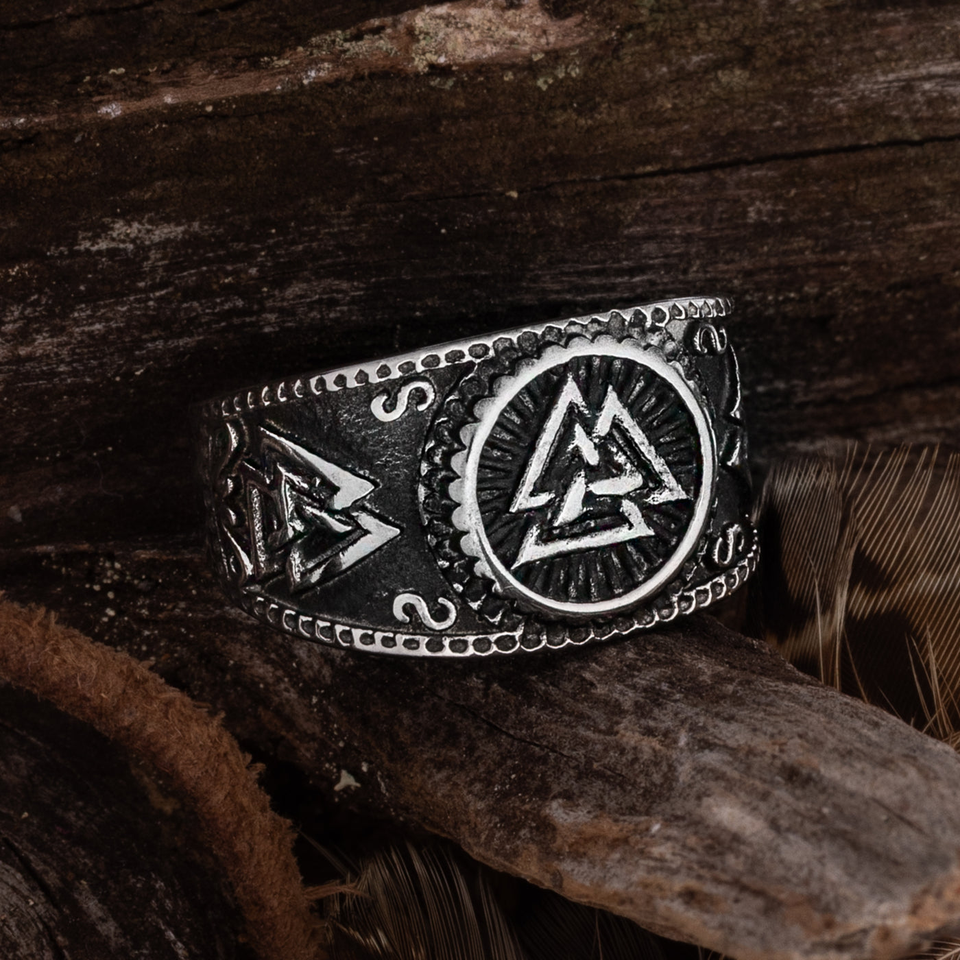 A contemporary design inspired by authentic Viking artifacts. Made out of Stainless Steel, it depicts the Valknut symbol and comes in sizes #8 to #15.